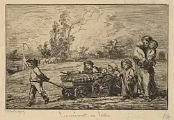 As the century progressed, new technical developments, especially lithography, which was gradually able to print successfully in colour, further depressed the use of etching. The style typical of the Etching Revival really begins in France with the prints of the Barbizon School in the 1840s and 50s. A number of artists, mainly painters, produced some landscape etchings which seemed to recapture some of the spirit of the Old Master print. Charles-François Daubigny, Millet and especially Charles Jacque produced etchings that were different from those heavily worked reproductive plates of the previous century.[7] The dark, grand and often vertical format townscapes of Charles Meryon, also mostly from the 1850s, provided models for a very different type of subject and style which was to remain in use until the end of the revival, though more in Britain than France.[8]