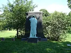 Eternal Silence has been called "eerie",[6] "somber",[6] "grim-looking",[7] "mysterious",[8] and "haunting".[8] The bronze figure, based on traditional depictions of the Grim Reaper, is set against a black granite base and stands 10 feet (3.0 m) tall upon that base.[6] The black granite provides contrast for the bronze statue, which is heavily oxidized because of its age.[6][9] The cemetery used to shine the statue to return its true bronze patina but received many complaints and requests to return it to its more dramatic green sheen; the cemetery now keeps the statue in its preferred oxidized state. The hooded figure was influenced by Taft's own "ideas on death and silence".[5] Historically speaking, the figure in Eternal Silence is related to the sculpted funeral procession around the Tomb of Philip the Bold in Dijon, France and the Adams Memorial by Augustus Saint-Gaudens in Washington, D.C.[5] The statue has been noted as Graceland Cemetery's most "unforgettable" monument.[1][6][9] The monument was designed by Taft and cast by Jules Bercham.[10] On its base, Taft inscribed the north side with his signature; the south side is inscribed with Am. Art Bronze Foundry J. Bercham -Chicago-.[6] The monument falls within Art Nouveau style.[5]