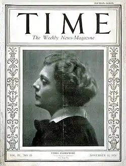 Barrymore, along with friend Marie Dressler, was a strong supporter of the Actors' Equity Association and had a high-profile role in the 1919 strike. During the strike, Ethel and Lionel Barrymore starred in a benefit show staged by AEA at the Lexington Avenue Opera House.[10] AEA came into being primarily to allow performers to have a bigger share in the profits of stage productions and to provide benefit to elderly or infirm actors. Barrymore's involvement in AEA may have been motivated by the fate of both of her parents, both long standing actors, her mother who had needed proper medical care and her father who required years of institutionalized care. Her support for the strike angered many producers and cost Barrymore her friendship with George M. Cohan, an actor, songwriter and producer.[11]