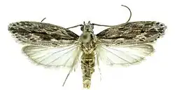 The length of the forewings is 10.8–12 mm (0.43–0.47 in) for males and 11.1–12.7 mm (0.44–0.50 in) for females. The ground color of the forewings is brownish with irregular darker markings. There is an elongated dark mark in the posterior area, as well as an irregular black band from the base to the apex. The hindwings are whitish.