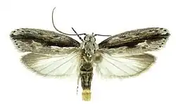 The length of the forewings is 10.4–14 mm (0.41–0.55 in). The ground color of the forewings is whitish gray, clouded with pale brownish gray except at the terminal margin. The ground color of the hindwings is semitranslucent white, becoming pale brownish at the distal margins.[1]
