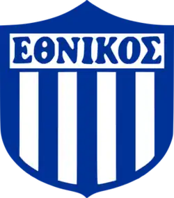 Ethnikos' crest has changed through times. The original club logo was a white cross in a blue coloured badge with the monotype E in the middle of the cross depicting the Greek flag. Later it was replaced by one with five blue and four white stripes having the club's name on the top of the badge, again resembling the Greek flag. After the 2011 takeover of the club by Alexis Aggelopoulos, the logo was changed once again to a more "modern" looking one but with supporters's demand, the older one was restored. Throughout the entire club's history its colours were blue or cyan and white, to resemble the colours of the Greek flag.