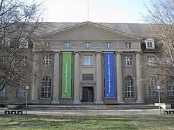 The Ethnologisches Museum was founded in 1873 and opened its doors in 1886 as the Royal Museum for Ethnology (German: Königliches Museum für Völkerkunde), but its roots go back to the 17th-century Kunstkammer of the rulers of Brandenburg-Prussia.[2] As the museum’s collections expanded in the early 20th century, the museum quickly outgrew its facility in the center of Berlin on Königgrätzer Straße (today named Stresemannstraße).[3] A new building was erected in the suburb of Dahlem to house the museum’s store rooms and research collections. In World War II, the main building of the museum was heavily damaged. It was demolished in 1961, and the buildings in Dahlem (in what was then West Berlin) were reconfigured to serve as the museum's exhibition spaces.