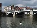 This practice continued until 1845 when a scholar refused to associate with the inns because they were a "temptation" to Eton students.[5] Eton was favourably modernised and was the first village in the UK to have its own post office and modern drainage system.[11] By 1925 the town was described as more commercial than residential, with most of the buildings (apart from those of the school itself) belonging to businesses serving the schoolboys.[5] In April 1970, Windsor Bridge, connecting Eton to Windsor, was closed to all motorised traffic. All traffic must now travel via Royal Windsor Way (formerly the Windsor and Eton relief road),[12] a bypass opened in 1966.