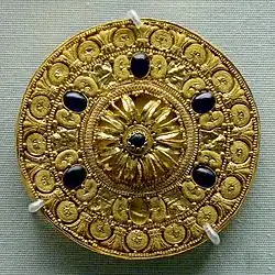 Granulation was the art of decorating smooth surfaces of gold jewelry with patterns composed of tiny granules of gold. It was invented in Mesopotamia in the third millennium BC and was subsequently introduced to Anatolia, Syria, Egypt, Cyprus and Mycenaean Greece. The collapse of the Bronze Age civilization brought with it the disappearance of such sophisticated arts in Greece, but they survived in the Near East and from there they were reintroduced in Greece in the 9th century and transferred to Italy during the second half of the 8th century.