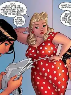 Enrolled in the fictional Holliday College for Women (and often accompanied by her fellow students, "the Holliday Girls"), Etta would become a constant feature of Wonder Woman's Golden Age adventures, effectively functioning as both the hero's plucky sidekick and her best friend. Unapologetically proud of her plus-sized figure (and vocal about her love of sweets), "Etta's appearance was a stark contrast to the svelte, wasp-waisted women depicted in most comic books, and Etta was a brave and heroic leader who was always in the thick of the fight beside her friend Wonder Woman."[3] Though appearing less frequently in the Silver and Bronze Age, Etta was a recurring presence in Wonder Woman's supporting cast throughout both periods. She would be re-imagined in March 1987[4] by comics writer/artist George Pérez as part of his post-Crisis relaunch of the Wonder Woman mythos. This milder-mannered version, a former U.S. Air Force captain and intelligence officer, is not presented as Wonder Woman's best friend, but rather as a genial ally among a larger cast of supporting characters.[5]