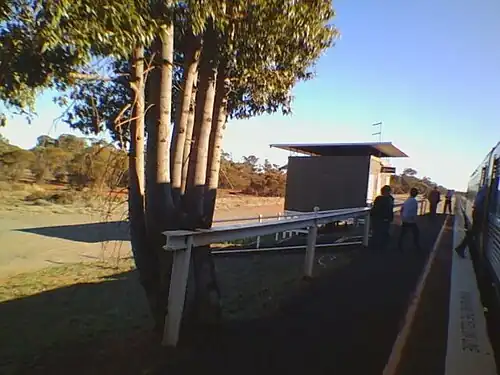 ![]() The platform at Euabalong West with a train to Broken Hill in view | |||||||||||