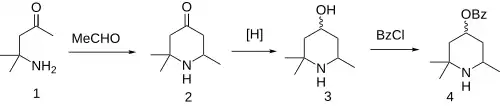 Condensation of diacetonamine [625-04-7] (1) with acetaldehyde (paraldehyde) rather than acetone gives the piperidone containing one less methyl group, i.e. 2,2,6-trimethylpiperidin-4-one [3311-23-7] (2). Reduction of the ketone with sodium amalgam gives the alcohol as a mixture of isomers, 2,2,6-trimethylpiperidin-4-ol (3). Benzoylation then affords beta-eucaine (4).