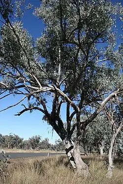 It is associated with inland grey box, fuzzy box (E. conica), yellow box (E. melliodora), Pilliga grey box (E. pilligaensis), red ironbark (E. sideroxylon), narrow-leaved ironbark (E. crebra), Blakely's red gum (E. blakelyi), apple species (Angophora), black cypress (Callitris endlicheri), white cypress (Callitris glaucophylla), kurrajong (Brachychiton populneus) and wattles (Acacia) species.[4]