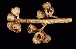 The flowers are arranged in unbranched groups of seven in leaf axils on a peduncle 3–8 mm (0.1–0.3 in) long, the individual buds on a pedicel usually up to 3 mm (0.1 in) long. The mature buds are green with a red tinge, oval to spindle-shaped, 4–5 mm (0.2–0.2 in) long, 3–4 mm (0.1–0.2 in) wide with a conical operculum. Flowering occurs in winter and the flowers are white. The fruit is cup-shaped to hemispherical, 5–7 mm (0.2–0.3 in) long and 7–9 mm (0.3–0.4 in) wide. The leaves are dark green on both sides, with prominent veins. Flowering occurs from January to March and the flowers are white. The fruit is a woody, conical to hemispherical capsule 3–4 mm (0.1–0.2 in) long and 4–7 mm (0.2–0.3 in) wide.[3][4][5]