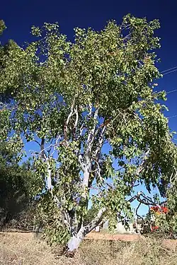 Eucalyptus bigalerita, commonly known as the northern salmon gum,[3] Adelaide River white gum,[4] or poplar gum[5] is a species of tree that is endemic to north-western Australia. It has smooth bark, large triangular to more or less round adult leaves, flower buds in groups of seven, white flowers and conical to hemispherical fruit.