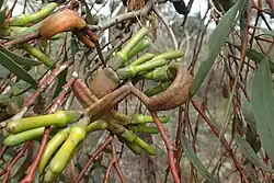 Eucalyptus burdettiana, commonly known as Burdett gum or Burdett's mallee,[1] is a species of flowering plant in the family Myrtaceae and is endemic to Western Australia. It is a mallee or shrub with smooth bark, lance-shaped adult leaves, flower buds with an elongated horn-shaped operculum, greenish-yellow flowers and cup-shaped or bell-shaped fruit.