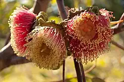 Eucalyptus youngiana is a mallee that typically grows to a height of 4 to 8 metres (13 to 26 ft), less commonly a tree to 10 m (33 ft), and forms a lignotuber. It has rough, flaky, dark grey-brown bark on part or all of the trunk and smooth, pinkish-grey to creamy bark above. Young plants and coppice regrowth have greyish green, egg-shaped to lance-shaped leaves that are 70–160 mm (2.8–6.3 in) long and 25–45 mm (0.98–1.77 in) wide. The adult leaves are the same shade of dull bluish green on both sides, lance-shaped, 85–170 mm (3.3–6.7 in) long and 15–37 mm (0.59–1.46 in) wide, tapering to a petiole 15–32 mm (0.59–1.26 in) long. The flower buds are arranged in leaf axils in groups of three on an unbranched peduncle 10–25 mm (0.39–0.98 in) long, the individual buds on pedicels 5–15 mm (0.20–0.59 in) long. Mature buds are oval, 45–60 mm (1.8–2.4 in) long and 30–45 mm (1.2–1.8 in) wide with a horn-shaped or beaked operculum 28–42 mm (1.1–1.7 in) long. Flowering occurs from June to October and the flowers are red, pink or bright yellow. The fruit is a woody, short, broad and hemispherical capsule, 15–30 mm (0.59–1.18 in) long and 33–60 mm (1.3–2.4 in) wide with coarse, longitudinal ridges. The seeds are brown, an irregular pyramid shape and 2.5–4 mm (0.098–0.157 in) long.[3][4][5][6]