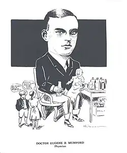 Mumford was born in 1879 in New Harmony, Indiana to a family of prominent Owenites. Mumford graduated from the University of Wisconsin in 1901 and Johns Hopkins in 1905. He obtained postgraduate training at Boston Children's Hospital and Gouverneur's Hospital in New York. He returned to Indiana in 1915 to establish a children's orthopedics practice and married Elsa Frenzel in 1917. His practice was interrupted by WWI, where he served as a captain at the "Eli Lilly" Base Hospital No. 32 in Contrexeville, France.[3] He returned to Indianapolis after the war and opened the Indianapolis Industrial Clinic with Dr. Jay Reed in 1920.[2] He later was appointed to the faculty at the Medical College of Indiana and was one of the first surgeons at the James Whitcomb Riley Hospital for Crippled Children. He continued these appointments until his 1961 death in Indianapolis.