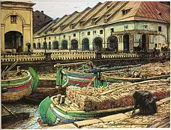 Eugene Lanceray was younger than the masters of Mir iskusstva and initially acted as their student. His creative method and aesthetic views evolved under the influence and guidance of Benois, although, by some aspects of his talent, Lanceray may have exceeded his teacher. His first significant works in the field of easel painting and graphics were created in the late 1890 - early 1900s. The main creative interests of the artist were turned at that time to the "historical", mainly architectural landscape.[4]