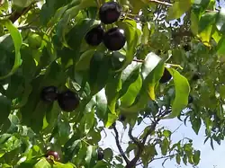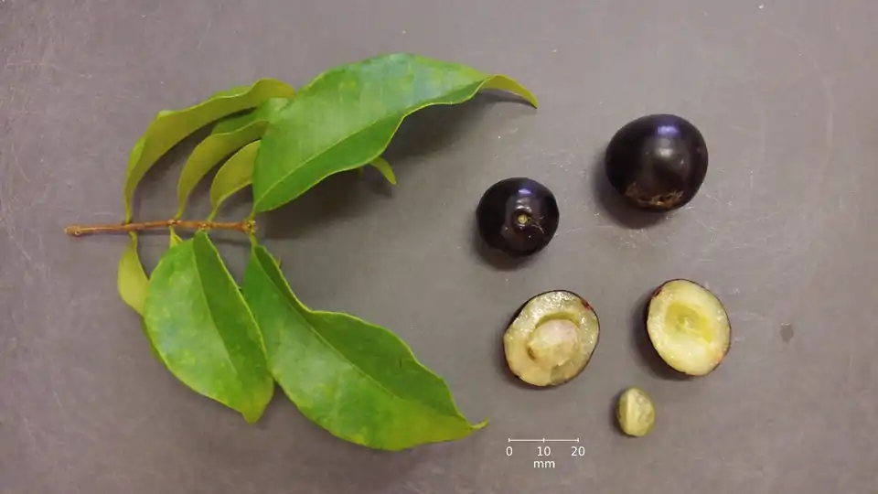 Fruits mature between February and March. The ripe fruit is a round or slightly elongated berry, up to 20 mm (0.79 in) wide and 25 mm (0.98 in) long. It has a thin purple-black skin and a wet, firm, whitish pulp about 3–5 mm (0.12–0.20 in) thick, surrounding a loose single (rarely double) seed. It is edible, moderately sweet, with an aroma similar to (but less intense than) that of the jabuticaba.[4]