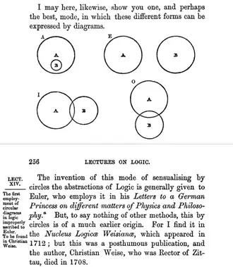 As shown in the illustration to the right, Sir William Hamilton erroneously asserted that the original use of the circles to "sensualize... the abstractions of logic"[5] was not Euler (1707–1783) but rather Weise (1642–1708);[6] however the latter book was actually written by Johann Christian Lange, rather than Weise.[2][3] He references Euler's Letters to a German Princess.[7][a]