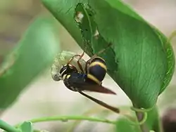 When a cell is completed, the adult wasp typically collects beetle larvae, spiders, or caterpillars and, paralyzing them, places them in the cell to serve as food for a single wasp larva. For example, Euodynerus foraminatus paralyzes the larvae of the poison hemlock moth (A. alstroemeriana).[3] As a normal rule, the adult wasp lays a single egg in the empty cell before provisioning it. Some species lay the egg in the opening of the cell, suspended from a thread of dried fluid. When the wasp larva hatches, it drops and starts to feed upon the supplied prey for a few weeks before pupating. The complete lifecycle may last from a few weeks to more than a year from the egg until the adult emerges. Adult potter wasps feed on floral nectar.