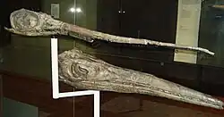 The name Ichthyosaurus longirostris was first published by Mantell in 1851 in a guide to the paleontological galleries of the old British Museum, where one of the ichthyosaurian specimens was displayed as Ichthyosaurus longirostris.[9] That specimen had an exceedingly slender and elongated muzzle, but the skull was crushed. No characteristics were preserved. The specific name, longirostris, was just affixed to the specimen. Since the features were so unclear, scientists at that time were not able to name this specimen.[9] The first skull of Eurhinosaurus longirostris was found by Owen and Jaeger in Switzerland in 1856, which showed clearly shortened mandibles.[4] The genus Eurhinosaurus was erected in 1909 in a paper describing the Miocene cetacean Eurhinodelphis cocheteuxi. Abel noted that it was not certain whether the cetacean's mandible extended to the tip of the snout or whether it was abbreviated, which was like the case in Ichthyosaurus longirostris in 1851.[9] He considered that the weak, attenuated mandible and some other distinguishing features of Ichthyosaurus longirostris were enough to erect a separate genus and names it Eurhinosaurus.[9] The type species by monotype, was Eurhinosaurus longirostris.[9] In 2022, a second species, E. quenstedti was described from Germany. The original species, E. longirostris was considered dubious due to the poor preservation of the type specimen, with the species E. huenei, based on a complete skeleton described in 1930, resurrected to replace it.[10]