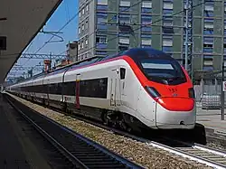 Since December 2017, the EuroCity label is supplemented by the new classification EuroCity Express (ECE). Initially, it was only used for a single service, between Frankfurt (Main) to Milan (via Basel SBB and Lucerne), operated by SBB's ETR 610 high-speed tilting trains.[7] Since 2024, SBB RABe 501 ("Giruno") trainsets of SBB are used on this line.[8] Another ECE service was introduced in December 2020 between München Hbf and Zurich HB, via Bregenz, also operated by ETR 610 trainsets of SBB. The ECE classification is only used in Germany; in Austria, Italy, and Switzerland these trains run as EC. This is due to tariff reasons: in Germany, EC normally are classified below ICE, the highest class, and thus slightly cheaper. ECE however are the same rank as ICE, and are priced as such, as the Deutsche Bahn claims them to provide similar levels of comfort.