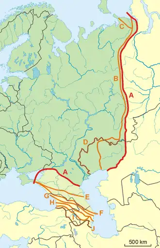 In Russia and the Soviet Union, the boundary along the Kuma–Manych Depression was the most commonly used as early as 1906.[47] In 1958, the Soviet Geographical Society formally recommended that the boundary between the Europe and Asia be drawn in textbooks from Baydaratskaya Bay, on the Kara Sea, along the eastern foot of Ural Mountains, then following the Ural River until the Mugodzhar Hills, and then the Emba River; and Kuma–Manych Depression,[48] thus placing the Caucasus entirely in Asia and the Urals entirely in Europe.[49] The Flora Europaea adopted a boundary along the Terek and Kuban rivers, so southwards from the Kuma and the Manych, but still with the Caucasus entirely in Asia.[50][51] However, most geographers in the Soviet Union favoured the boundary along the Caucasus crest,[52] and this became the common convention in the later 20th century, although the Kuma–Manych boundary remained in use in some 20th-century maps.