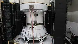 Lockheed Martin is building the two adapters, connecting the service module to the crew module and to the upper stage of the Space Launch System, and also the three fairing panels that are jettisoned after protecting the service module during launch and ascent.[18]