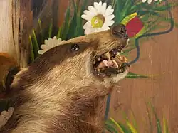 European badger skulls are quite massive, heavy and elongated. Their braincases are oval in outline, while the facial part of their skulls is elongated and narrow.[36] Adults have prominent sagittal crests which can reach 15 mm tall in old males,[37] and are more strongly developed than those of honey badgers.[38] Aside from anchoring the jaw muscles, the thickness of the crests protect their skulls from hard blows.[39] Similar to martens,[40] the dentition of European badgers is well-suited for their omnivorous diets. Their incisors are small and chisel-shaped, their canine teeth are prominent and their carnassials are not overly specialized. Their molars are flattened and adapted for grinding.[37] Their jaws are powerful enough to crush most bones; a provoked badger was once reported as biting down on a man's wrist so severely that his hand had to be amputated.[41] The dental formula is 3.1.3.13.1.4.2.