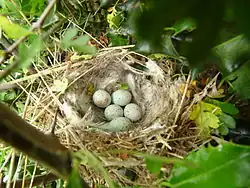 The breeding season lasts from the second half of March until June; fledging takes place in early July. Woodland edges, farmland hedges and gardens with relatively thick vegetation are favoured for breeding.[12] The nest is placed in trees or bushes.[13][14] The nest is built by the female who is accompanied by the male. The clutch consists of 4–6 eggs which are laid at daily intervals usually beginning one or two days after the completion of the nest. The eggs are greyish-white, bluish-white or beige with reddish or brownish spots or blotches concentrated at the broader end. On average the eggs measure 20.0 mm × 14.6 mm (0.79 in × 0.57 in) and weigh 2.17 g (0.077 oz). They are incubated by the female for 13–14 days.[15] The male feeds her at the nest during this period. Chicks are covered with thick, long, greyish-white down at hatching. They are fed on insect larvae by both adults during the first days, and later, by a frequently regurgitated yellowish paste made of seeds. They leave the nest about 13 days later, but they are not able to fly. Usually, they fledge 16–18 days after hatching. This species produces two or three broods per year.[13][14]
