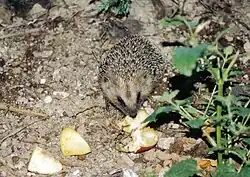 The European hedgehog is an insectivore. Its diet consists largely of earthworms, as well as snails and slugs, beetles, ants, bees and wasps, earwigs, cockroaches, crickets and grasshoppers, butterflies and moths, and caterpillars and other insect larvae.[12] Eggs of ground-nesting birds are also taken and carcasses may be foraged on. Hedgehogs may also eat lizards, snakes, frogs and small rodents.[12] Plant matter appears to make up only a negligible part of the hedgehog's diet.[13][14][15]