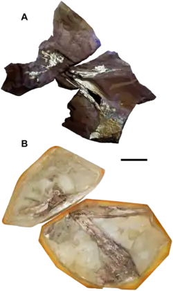 The holotype, MCCM-LH 9413, was uncovered at the Las Hoyas site in a chalkstone layer of the Calizas de La Huergina Formation dating from the late Barremian. It consists of a partial skull with lower jaws, compressed on a slab and counterslab. Two elements of the hyoid are present also. The skull has been vertically crushed, the lower jaws horizontally. The specimen was prepared by Mercedes Llandres Serrano, and is part of the Las Hoyas collection of the Museo de las Ciencias de Castilla–La Mancha.[1]