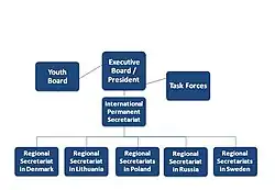 Since 29 October 2010 the Executive Board of the Euroregion Baltic is the highest decision-making body of the organisation. According to the new Statutes adopted by Council on that day, the Executive Board consists of up to two representatives of the highest possible political rank and one permanent deputy nominated by each member organisation and the Chairperson of the Youth Board.[18] The Board debates during formal meetings which may be ordinary or extraordinary. The meetings are held in English and in public unless the Board decides otherwise. Ordinary meetings must take place at least three times a year and they are summoned by the ERB President. Extraordinary meetings may take place at any time decided upon by the Board.[19] Decisions of the Board are based on consensus and each member organisation as well as the Chair of the Youth Board all have one vote. The Board has the right to initiate and adopt changes to the ERB Statutes; prepare and approve long-term programmes, biennial actions plans and other strategic documents; prepare, adopt and implement resolutions, joint statements and positions; elect ERB President and Vice-President; approve annual activity reports from the ERB President; approve annual activity and financial reports from the International Permanent Secretariat and the Youth Board; decide on enlarging of the ERB territory and approve withdrawal or suspension of the Parties; establish ad hoc task forces; confer the title of the ERB honorary membership.[20]