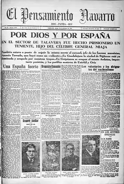 Under Echave-Sustaeta's guidance El Pensamiento Navarro emerged as a vehemently Carlist newspaper; it was intended for a possibly broad audience and prioritized news and short articles over doctrinal and ideological dissertations.[65] In the early 20th it was selling in some 1,800 copies,[66] a rather good result for a city of 30,000 inhabitants, though falling far behind 3,000 of the conservative competitor, El Eco de Navarra. The latter closed in 1903, but its readers were taken over by a newly founded Maurista daily, Diario de Navarra.[67] El Pensamiento stood out due to its combative and intransigent style; in 1900 it cost Echave-Sustaeta detention, related also to general anxiety about another Carlist insurgency forthcoming,[68] and in 1901 a hefty fine, reduced in course of the appeal process.[69]