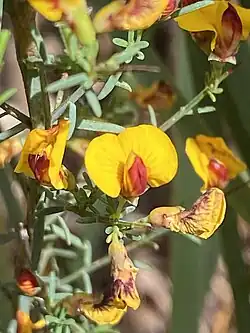 Plants grow to between 30 and 40 centimetres high. The small, grey green, narrow to ovate leaves are 2.3 to 4 mm long and 0.6 to 0.9 mm wide. The single pea flowers have dark red keels, yellow-orange wings, and a yellow-orange standard with red markings on the rear. These are produced between July and October in the species' native range.[1]