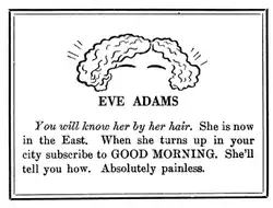 In 1923, Eve returned to New York, and signed a declaration of intention to become a US citizen. In February 1925, she wrote and published in 150 copies "for private circulation only" of Lesbian Love (written under the name Evelyn Adams), a collection of short stories describing lives of women of the lesbian community.[2] In March 1925, she opened Eve's Hangout, also known as Eve Addams' Tearoom in Greenwich Village. The only source that mentions a famous sign that allegedly read: "Men are admitted, but not welcome" is a 1926 article from Variety, which accused Adams of being financed by "a ring of rich women cultists" and inviting "mannish" women preying on girls. This led to Adams' biographer Jonathan Ned Katz to claim that the sign "probably never existed".[3]