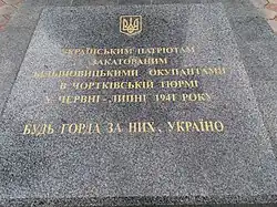 ![]() Plaque at Stepan Bandera Street in Chortkiv commemorating victims of the prison massacre | |