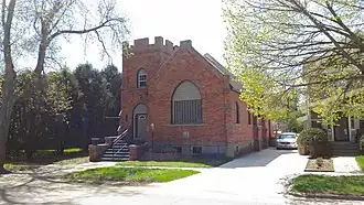 Its most salient feature is a castellated two-story tower. It has decorative brick and concrete false buttresses.[3]