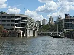 After being left vacant for a number of years, in 1988 the shipyard was redeveloped as a hotel and apartment complex called Dockside. One of the dry docks was retained as a marina.[13] There is a monument to the Evans Deakin shipyards in Captain Burke Park (at the eastern end of Holman Street) on the tip of Kangaroo Point (27°27′57″S 153°02′12″E / 27.4657°S 153.0367°E); this is further north than the original site of the shipyards.[14]