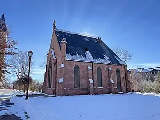 The Evans Memorial Chapel is a relatively small structure with an exterior of rusticated Colorado red sandstone.[1] The chapel's congregation rapidly outgrew the size of the building–roughly 40 feet wide, 50 feet long, and 40 feet tall[21] with seating for 64 congregants and a 12 person choir[47]–so the larger, since-demolished Grace Church sanctuary was adjoined.[35] An example of early Gothic Revival architecture,[57][8] its appearance has been described as "reminiscent of chapels in the west of France."[12] The chapel's single room sits on an east-west axis, terminating in an octagonal apse to the west. A choir is below the east window and the main entrance is found on the southern wall with a small vestibule. On the ceiling are ornate open tracery wood trusses.[1]