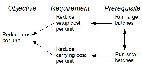 Goldratt has illustrated the use of the evaporating cloud technique in a discussion of the Economic production quantity model.[9]: 43  The prerequisite wants are to run large batches (D) and yet to run small batches (D’). These are clearly in conflict. The required need that D is trying to meet is to reduce setup cost (B), whereas the D’ prerequisite needs to reduce carrying cost per unit (C). Both requirements are aimed at the objective (A): to reduce cost per unit.