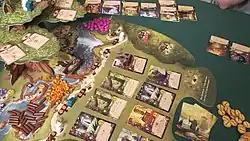 Over four seasons, players place their forest animal meeples to get resources to buy cards into a personal tableau, which give points towards winning the game or special abilities to help them build further.[2] The game starts simply, with the complexity increasing as a player's cards gain synergies from newly acquired cards.[3] In addition to the points they get from acquiring cards, players score by triggering events, from special events, from collecting certain combinations of card types, and from end game bonuses given by cards for acquiring certain other cards in their city.[4][5]