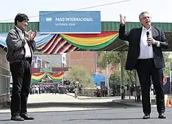 Morales' administration sought strong links with the governments of Cuba and Venezuela.[137] In April 2005 Morales traveled to Havana for knee surgery, there meeting with the two nations' presidents, Castro and Chávez.[138] In April 2006, Bolivia agreed to join Cuba and Venezuela in founding the Bolivarian Alternative for the Americas (ALBA), with Morales attending ALBA's conference in May, at which they initiated with a Peoples' Trade Agreement (PTA).[139] Meanwhile, his administration became "the least US-friendly government in Bolivian history".[140] In September Morales visited the U.S. for the first time to attend the UN General Assembly, where he gave a speech condemning U.S. President George W. Bush as a terrorist for launching the War in Afghanistan and Iraq War and called for the UN Headquarters to be moved out of the country. In the U.S., he met with former presidents Bill Clinton and Jimmy Carter and with Native American groups.[141] Relations were further strained between the two nations when in December Morales issued a Supreme Decree requiring all U.S. citizens visiting Bolivia to have a visa.[142] His government also refused to grant legal immunity to U.S. soldiers in Bolivia; hence the U.S. cut back their military support to the country by 96%.[134]