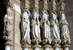 The ogival main portal is a masterpiece of Portuguese Gothic sculpture. The marble columns are occupied by huge statues of the Apostles executed in the 1330s, perhaps by sculptors Master Pero (Mestre Pero) and Telo Garcia. It is the best of its kind in Portugal. Such free-standing Gothic sculptures are rather rare in Portugal. They are usually associated with memorial graves.