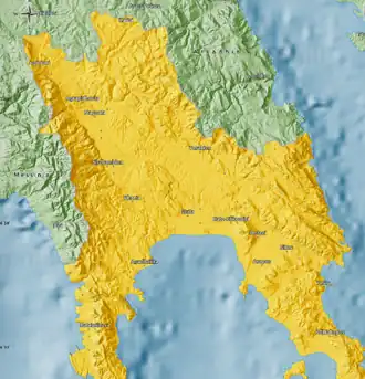 The Taygetus Massif is about 100 km (62 mi) long, extending from the center of the Peloponnese to Cape Matapan, its southernmost extremity. It contains the tallest mountain in the Peloponnese, the Profitis Ilias summit, reaching 2,405 m (7,890 ft);[9] this is probably the classical Mount Taléton mentioned by Pausanias.[10] The summit is an ultra-prominent peak. It is prominent above the Isthmus of Corinth, which separating the Peloponnese from mainland Greece, rises only to approximately 60 m (200 ft). Numerous creeks wash down from the mountains and the Evrotas has some of its headwaters in the northern part of the range. The western side of the massif houses the headwaters of the Vyros Gorge, which carries winter snowmelt down the mountain, emptying into the Messenian Gulf in the town of Kardamyli. The Parnon Massif is divided into three parts.[11] The northernmost, which is the highest, runs 30 kilometres (19 miles) from just north of Ano Doliana in North Kynouria, eastern Arcadia, southeast to Platanaki Pass. Platanaki, ancient Glyppia, is on the ancient route from Therapnes to South Kynouria between the peaks of Parnon, 1,935 metres (6,348 feet), and Psaris, 1,836 m (6,024 ft). Altitudes on the north rise from 1,100 m (3,600 ft) to 1,300 m (4,300 ft) increasing toward the peak to 1,600 m (5,200 ft) to 1,800 m (5,900 ft) with a tree line at 1,750 m (5,740 ft). Below it are forests of Black Pine and fir; above it, grasslands. Between the pass and Kounoupia to the south is 22 km (14 mi) of central Parnon, lower in altitude than the northern. The remaining 38 km (24 mi), even lower in altitude but still mountainous, runs from Kounouria to the sea at Epidaurus Limera, which is in Monemvasia. Parnon proper does not extend into the Malea Peninsula. In addition to the range of Parnon, two forelands can also be defined, east and west. Kynouria is located in the east foreland. In the west two lengths can be distinguished: from the northern flank of Parnon to Gkoritsa in Therapnes (on the road to Platanaki Pass), which is 6 km (3.7 mi) to 15 km (9.3 mi), and southward into the Malea Peninsula, 3 km (1.9 mi) to 9 km (5.6 mi) wide.