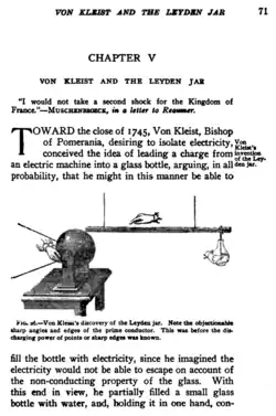 Influenced by Georg Matthias Bose,[1] he independently invented the Kleistian jar on 11 October 1745, which could store electricity in large quantities. He communicated this discovery to a group of Berlin scientists in late 1745, and the news was transferred in a confused form to Leyden University where it was further investigated. This became more commonly known as the Leyden jar after 's Gravesande's graduate student Pieter van Musschenbroek of Leyden.[2]