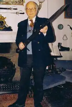 Ronald Ewart Oakeshott was born in 1916. His uncle Jeffery Farnol wrote romance novels and swashbucklers and also had a collection of antique swords, through which the young Oakeshott became interested in swords. After leaving Dulwich College, Oakeshott studied at the Central School of Art in London. He worked at Carlton Studios and at A.E. Johnson Ltd as a commercial artist,[1] while still being interested in collecting arms and armour. During the 1930s and 1940s, antique swords could still be acquired relatively cheaply and Oakeshott began collecting them. Because of the scarcity of information about these he began to research them himself. As a trained artist he illustrated most of his own books and also became a speaker on arms and armour.[2][3]