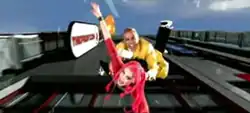The song's music video, which the video itself indicated was "presented" by Hype Williams, was partially based on the controversial anime Kite.[13] It was filmed in Los Angeles on January 24–26, 2000.[14] In the video, Stefani cross-dresses to enter a men's bathroom and, upon being discovered, assaults Tony Kanal (who plays her ex-boyfriend) and several other men. When Kanal regains consciousness, he grabs Stefani and jumps out the window, and the two plummet to the ground. The storyline is cut with scenes of the band playing on a stage. No Doubt's guitarist Tom Dumont initially played the part of a police officer but was cut from the final version of the "Ex-Girlfriend" video. He enacts the role in MTV's Making the Video.