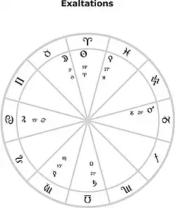 Each of the seven traditional planets has its exaltation in one zodiac sign. The positions are:[1]