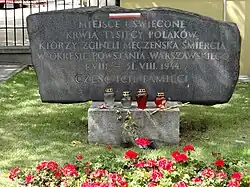 - 27/35 Marszałkowska Street – in the 1950s, a plaque designed by Karol Tchorek was unveiled on the front wall of the building, commemorating the residents of the houses on Marszałkowska Street murdered by the Germans in the first days of August 1944. In later years, another plaque was installed, commemorating the scouts from the Mokotów Grey Ranks who were executed at this site.[44]