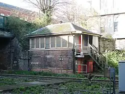 The B box was closed on 23 February 1970 and the A box was then renamed just 'Exeter Central'. This too closed on 6 May 1985 when control was transferred to the new panel signal box at St Davids.[2] With this change came resignalling; the westbound platform 2 was signalled for trains to run in either direction as was the westbound line to St Davids.[3] The signals are interlocked so that trains cannot start from either St Davids or Central until their route is clear right through to their platform at the other station; a feature replicated from the days of steam locomotives with less power or brakes than today's diesels when it was undesirable for trains to come to a stand on this steeply graded section of line.[9]