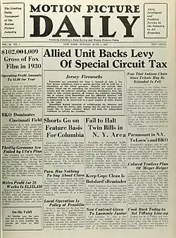 Martin Quigley had obtained several magazines during the 1910s and 1920s. In 1931, he began merging them into two magazines. The first four merged in late 1930 and became the Motion Picture Herald, which began publication on April 4, 1931.[2] Quigley followed this shortly after with the merger of his remaining three publications, Exhibitors Trade Review, Exhibitors Daily Review, and Motion Pictures Today to form Motion Picture Daily.[3] Its premiere issue hit the newsstands on Monday, June 1, 1931.[4]